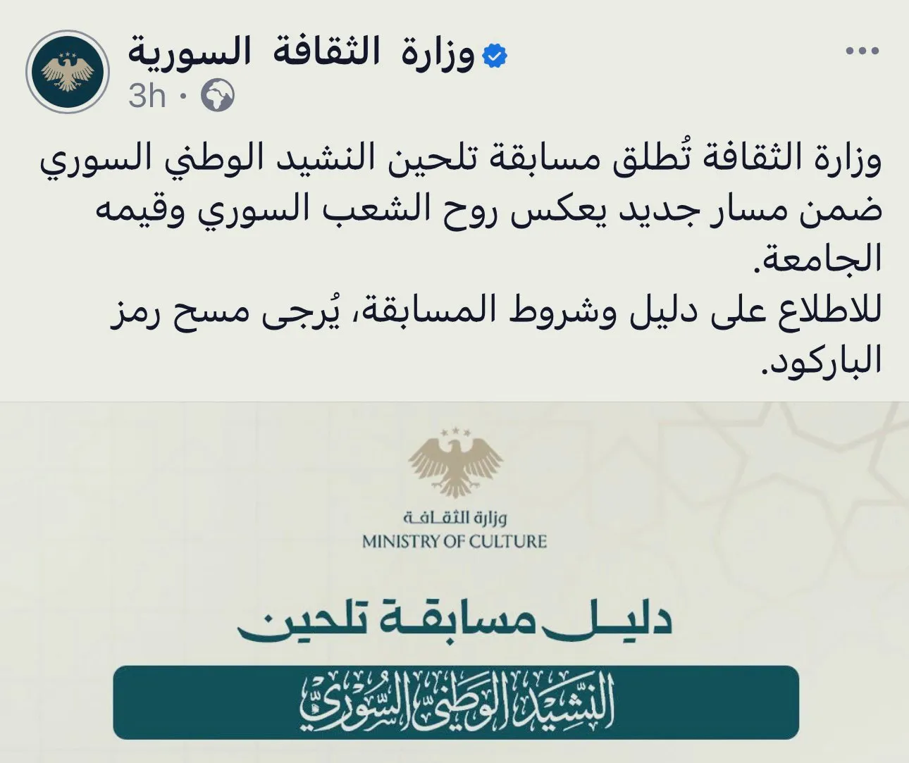 تحول ملف "النشيد الوطني السوري" الجديد إلى قضية رأي عام ومادة دسمة للجدل عبر منصات التواصل الاجتماعي، إثر إعلان وزارة الثقافة السورية عن مسابقة لتلحين سبعة نصوص شعرية اختارتها لجنة مختصة، وهو ما قوبل بموجة عارمة من الانتقادات التي تراوحت بين التشكيك القانوني والسخرية من "ضعف" المحتوى الأدبي.
