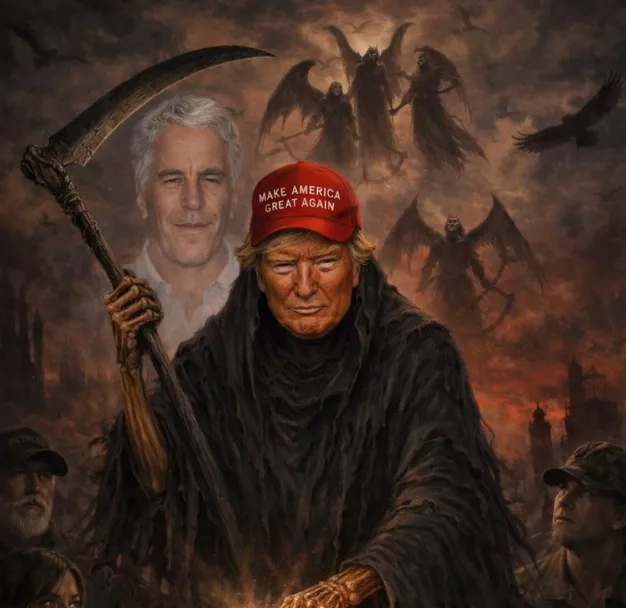 RûpelNews - الصورة، التي صُممت بأسلوب قاتم، أظهرت ترامب في هيئة أقرب إلى "حاصد الأرواح"، محاطاً بعناصر توحي بالموت والدمار، ما اعتبره مراقبون نقداً لاذعاً لسياساته، خاصة في ملفات داخلية وخارجية حساسة.