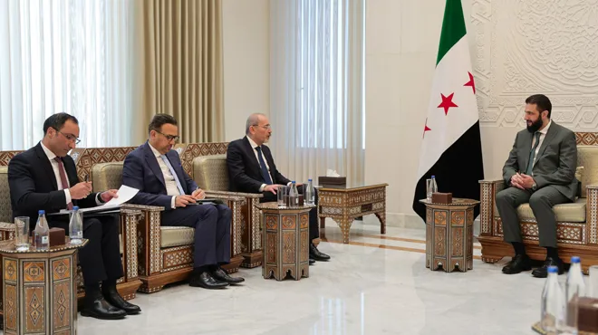 RûpelNews - استقبل الرئيس السوري، أحمد الشرع، وفداً أردنياً رفيع المستوى برئاسة وزير الخارجية أيمن الصفدي، وعضوية كل من رئيس هيئة الأركان المشتركة اللواء يوسف الحنيطي، ومدير دائرة المخابرات العامة أحمد حسني.