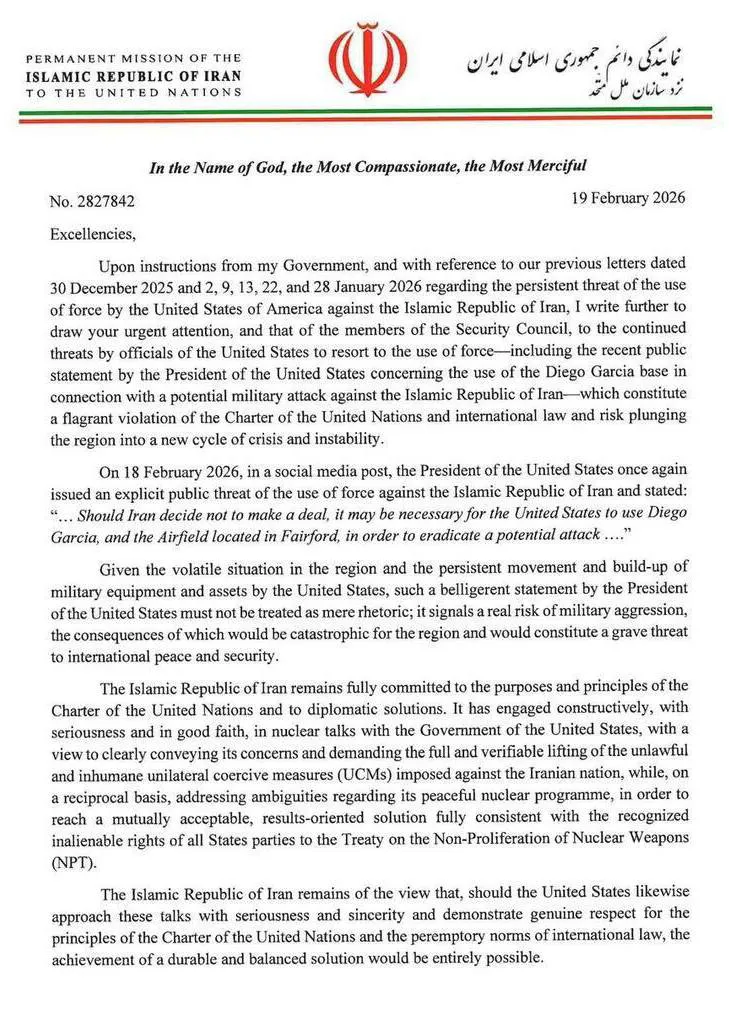 RûpelNews - وأوضحت البعثة الإيرانية في رسالتها أن التحرك الأمريكي تجاوز الخطاب الدبلوماسي إلى "تهديد علني صريح"، مشيرة تحديداً إلى تدوينة للرئيس الأمريكي نُشرت في 18 فبراير الجاري. وتضمنت التدوينة تلميحاً باستخدام قاعدة "دييغو غارسيا" في المحيط الهندي ومطار "فيرفورد" في بريطانيا لشن هجمات في حال عدم التوصل إلى اتفاق نووي، وهو ما اعتبرته طهران انتهاكاً صارخاً للمادة 2 (4) من ميثاق الأمم المتحدة.