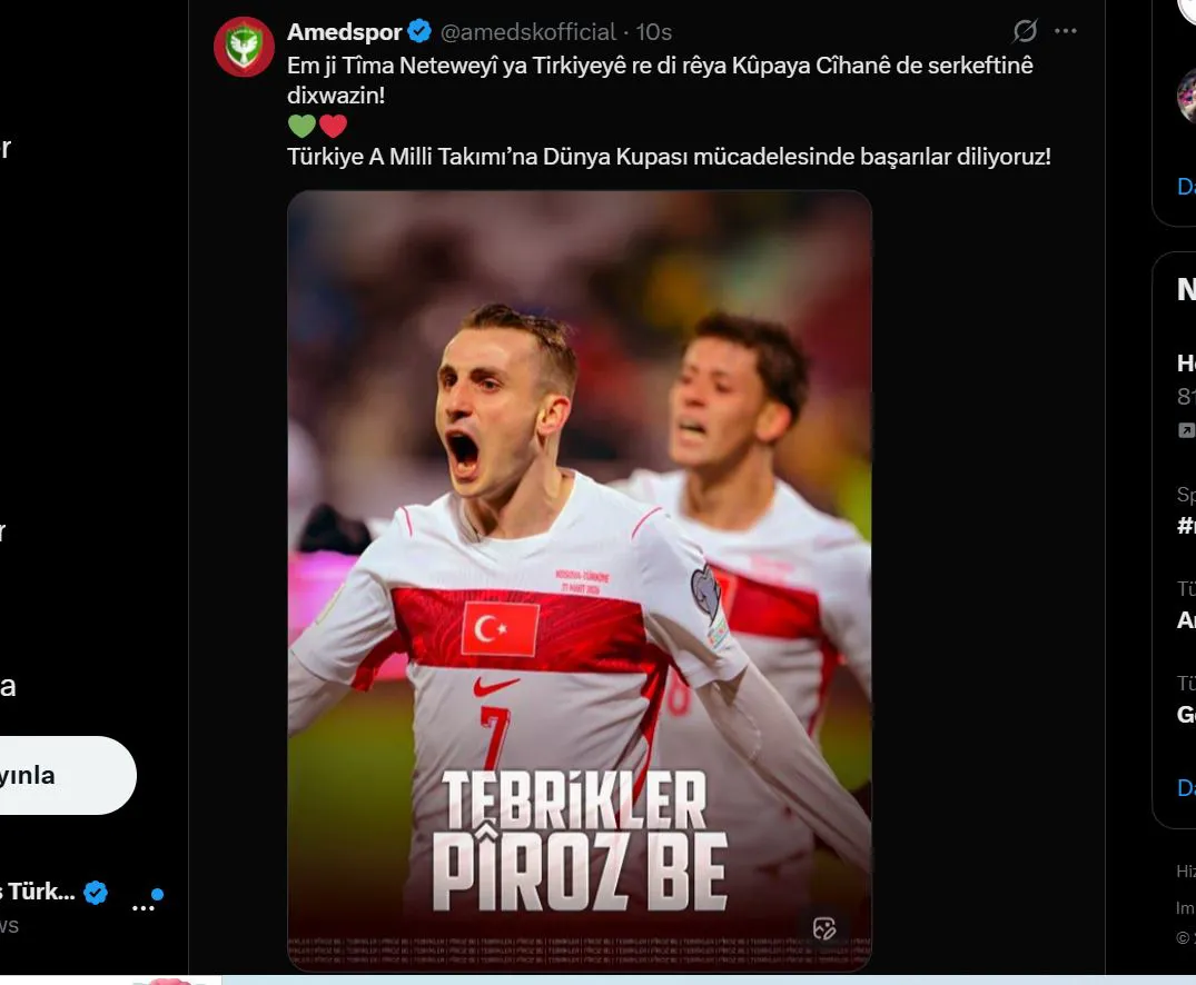 RûpelNews - Peyama Amedsporê, ku hem bi Tirkî hem jî bi Kurdî – "Tebrîkler – Pîroz be" – hatibû weşandin ji bo pîrozkirina têkûziya tîma neteweyî ya Tirkiyeyê bo Kûpaya Cîhanê piştî 24 salan, li ser medyaya civakî bû sedema nîqaşekê.