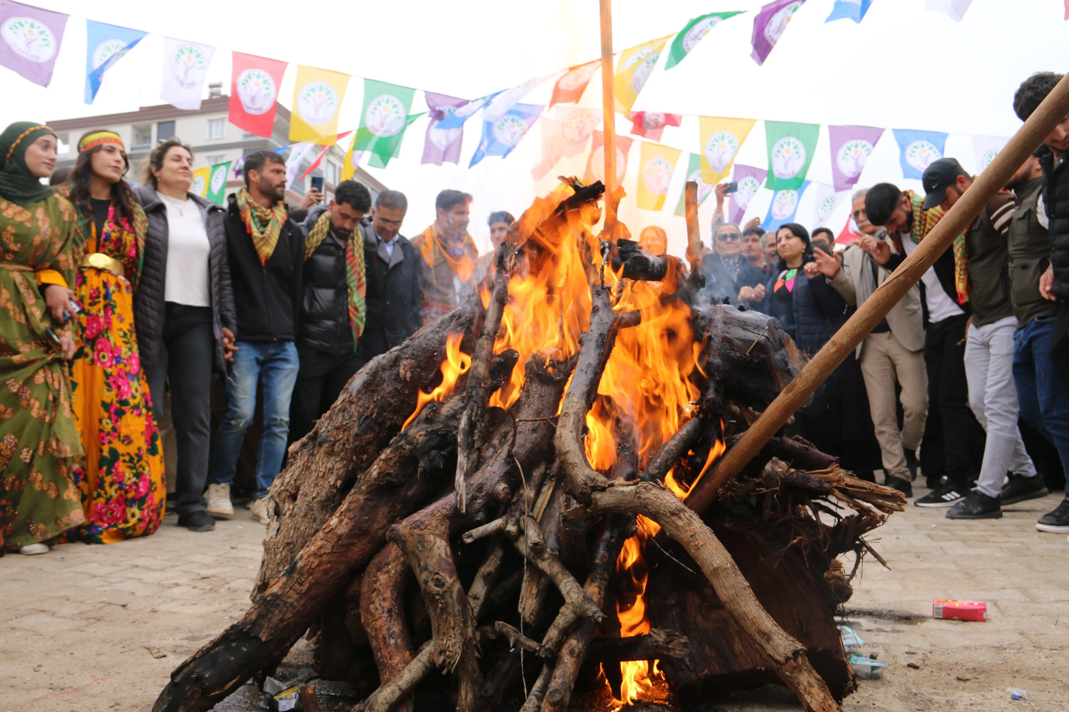 Konuşmaların ardından Newroz ateşi yakıldı ve yurttaşlar ateş etrafında halay çekerek kutlamayı sürdürdü.